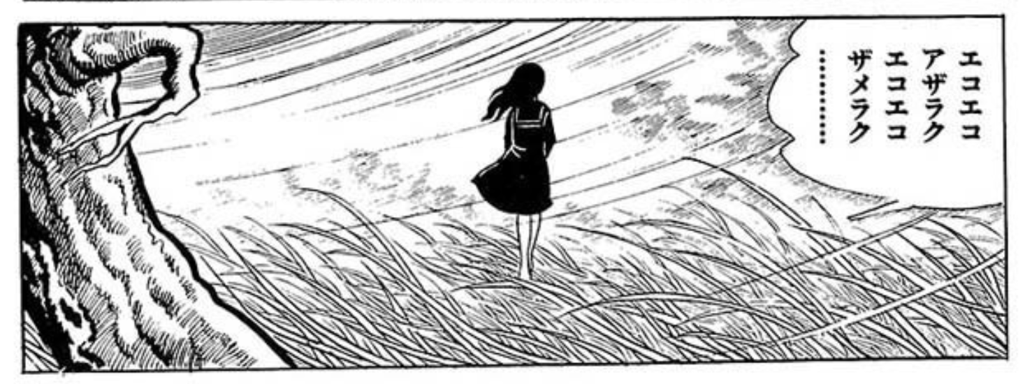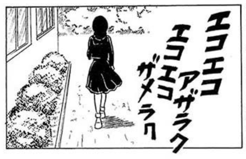 古賀新一が「週刊少年チャンピオン」に1795年から1979年にかけて連載した漫画「エコエコアザラク」。黒魔術(こくまじゅつ)を操る謎の女子中学生黒井ミサが主人公の連作短編形式のホラー漫画で、ラストのコマで「エコエコアザラク、エコエコザメラク」の呪文を唱えながら何処かへ去っていく黒井ミサの姿が印象的だった。