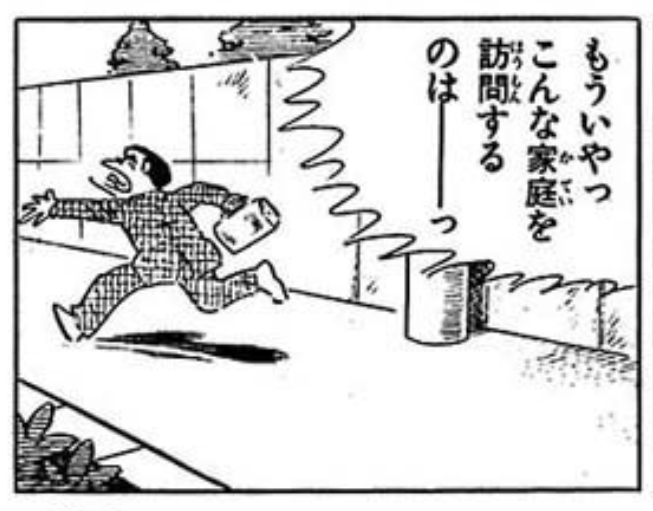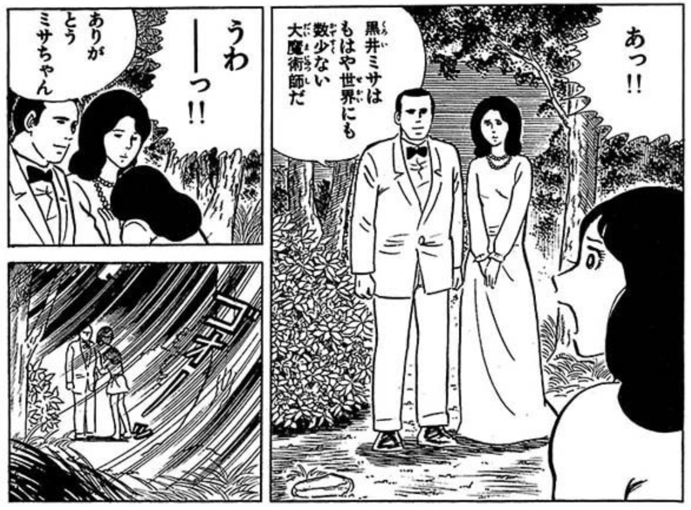 立ち去る黒井ミサの姿で終わるというお約束が守られなくなった結果目立つのは、何だかよく判らないコマで終わるという現象で、例えば下図は長らく魔術で人形の姿になっていたミサの両親が大魔術師となったミサの不思議な踊りで人間の姿に戻るという「エコエコアザラク」の中でも屈指の重要エピソードである「大魔術師・黒井ミサ」(10巻収録)のエンディングだが、「うわーっ!!」と人間の姿に戻った両親の胸に泣き崩れるというコマでストーリーとしては完結しているにもかかわらず、「ゴォーッ」という強風の中に立ち尽くす黒井一家という謎のコマが最後の一コマとして付されている。この蛇足ともいえるコマのため何とも気の抜けた奇妙な余韻でもって物語が終わる。